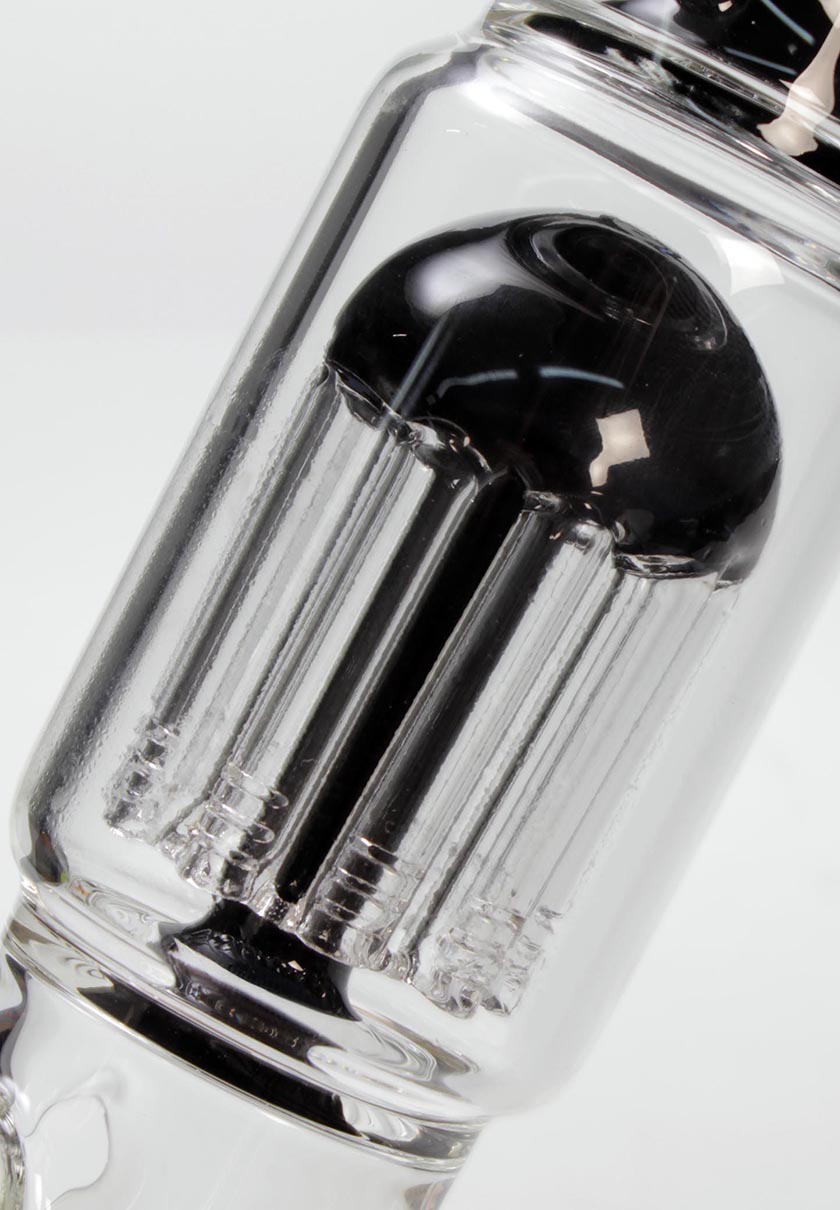 Die handgefertigte Wasserpfeife 'Mushroom' der Marke 'Blaze Glass' fasziniert durch den dekorativen, schwarz-weißen Mushroom im Zugrohr. Dieser dient als Spritzschutz für den darunter liegenden, 10-armigen Baumperkolator, der für eine ordentliche Wasser- und Rauchverwirbelung sorgt. Wichtig ist bei dieser coolen Bong aus bestem Borosilikatglas mit 5mm Wandstärke, dass das Wasser sowohl durch die Chillumöffnung wie auch durch das Mundstück eingefüllt wird.